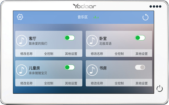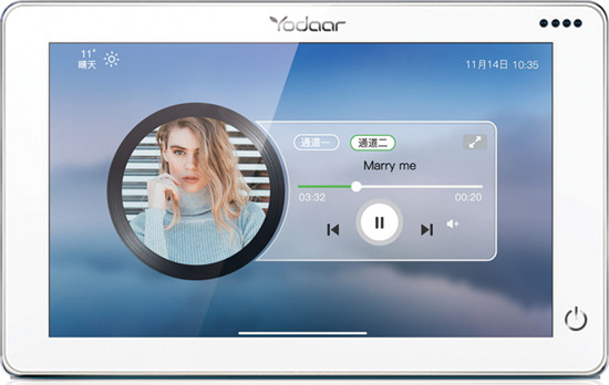在保證出色的音質(zhì)之外,悠達還從用戶操作角度出發(fā),對中央機控制面板進行了全新升級,推出背景音樂中控屏。其最大的特色在于,一塊面板可以控制所有房間的音樂,免去所有繁瑣操作。同時,它還可控制智能家居、聯(lián)動云門鈴、實現(xiàn)安防監(jiān)控,一屏四用,真正做到了行業(yè)獨家。