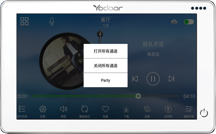 首先,最大的驚喜在于它實現(xiàn)了對所有通道的集中控制。家里裝有中央機的用戶可能會有這樣的體驗,不同房間的音樂雖然可以獨立控制,但每個房間必須單獨配置控制面板,這無疑讓安裝變得更加繁瑣,也在無形中增加了面板和布線的成本。但是現(xiàn)在,只需要一個中控屏,就可對所有房間的音源選擇、歌曲播放、音量大小、開關(guān)機等進行控制,并且支持一鍵Party,每個房間共享同一首音樂。