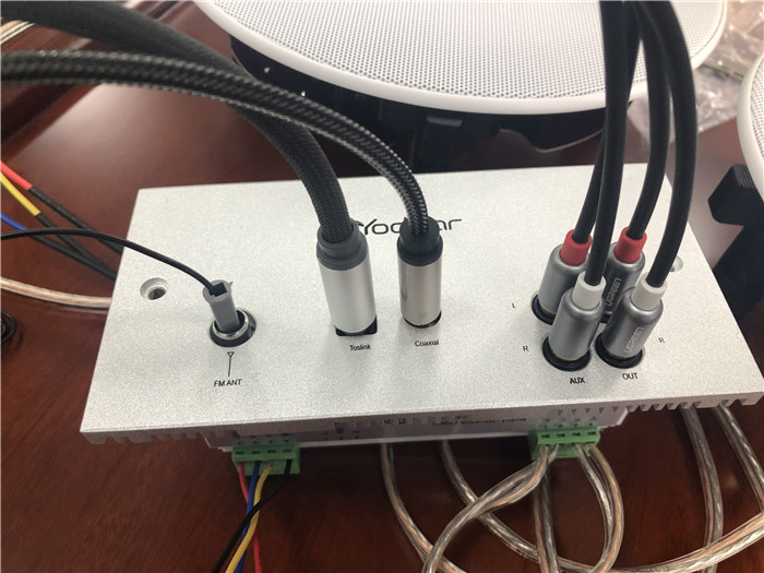 因為很多背景音樂系統(tǒng)不是獨(dú)立功放,所以我特意上網(wǎng)查了下,發(fā)現(xiàn)功放和控制面板分開更利于散熱,整體性能也會更加穩(wěn)定。而且這些接口是悠達(dá)分體機(jī)特有的,比如FM接口插上天線后,可以聽本地的電臺,光纖/同軸解決可以接家里最新款的電視,一路AUX外接音源可以接電視或者DVD,一路音源輸出接口(OUT)可以接低音炮,功能不要太強(qiáng)大~