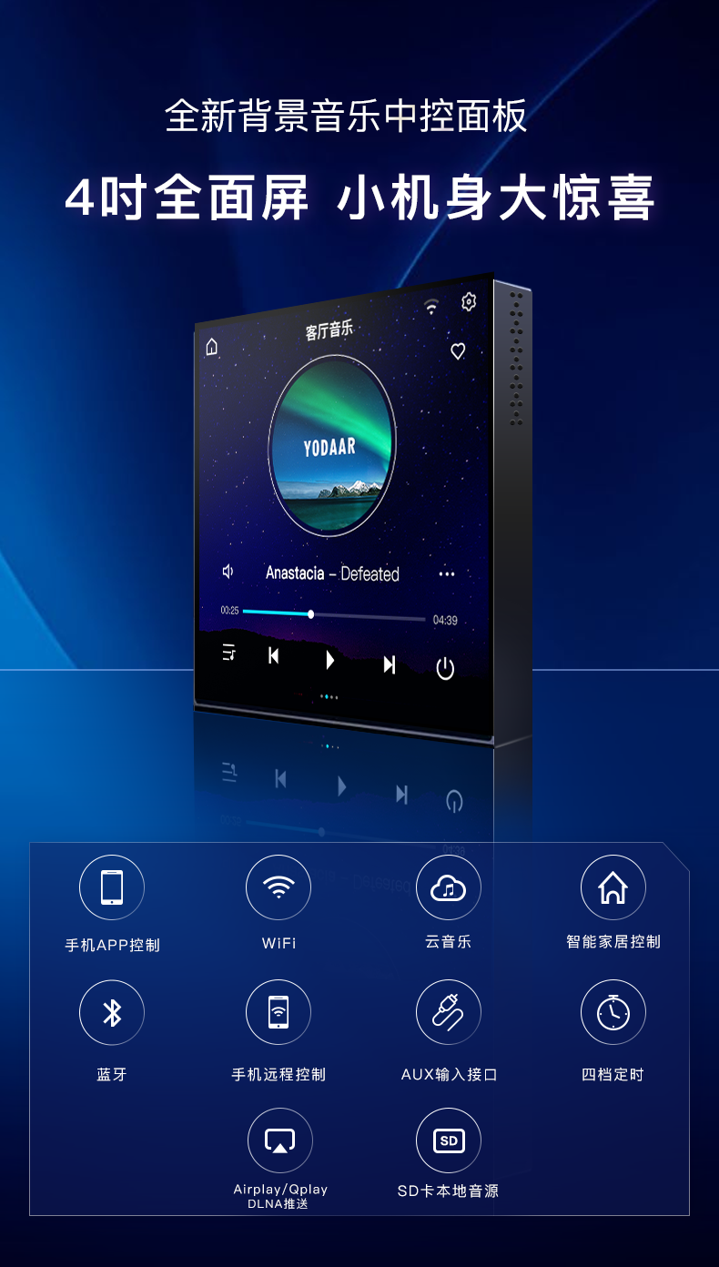 新4吋面板機身雖小,功能卻十分齊全、強大。一塊面板即可集中控制所有音樂分區,包括歌曲播放、音量大小、開關機都可控制,并支持一鍵創建/解散Party,日常聽歌更加方便。