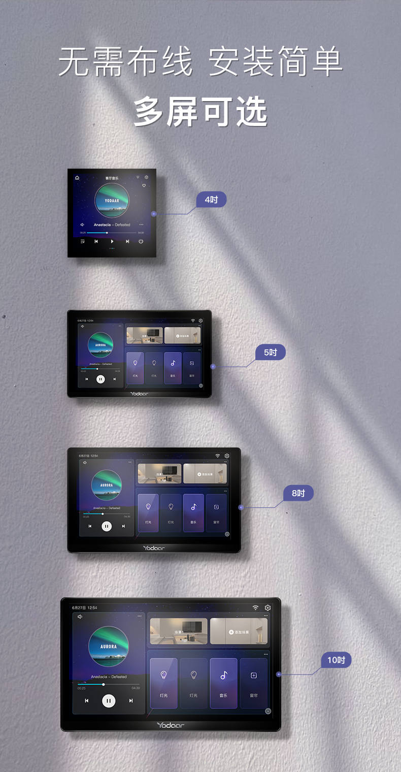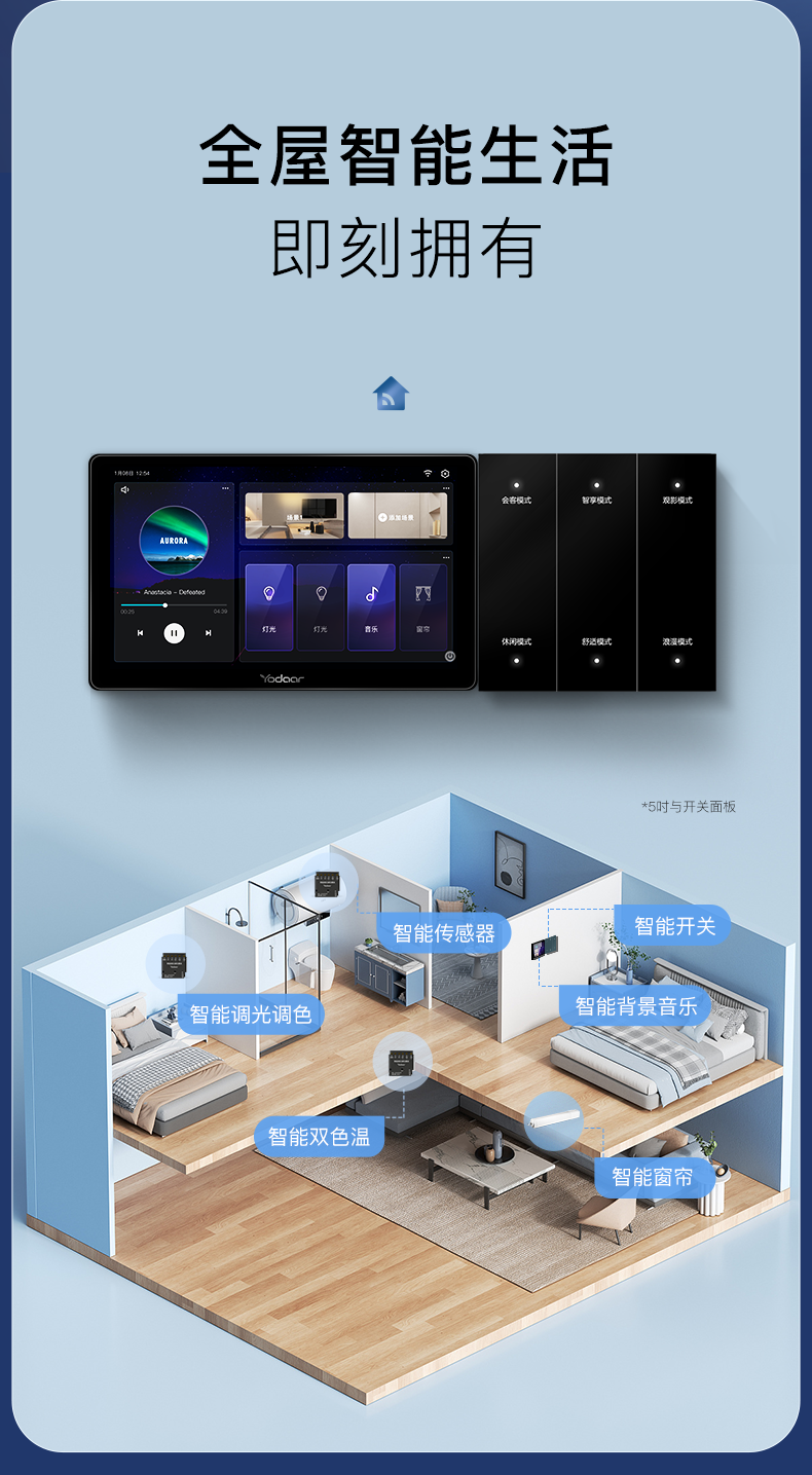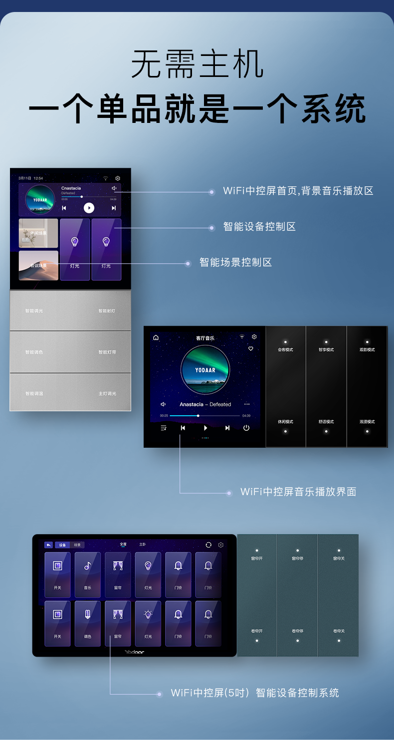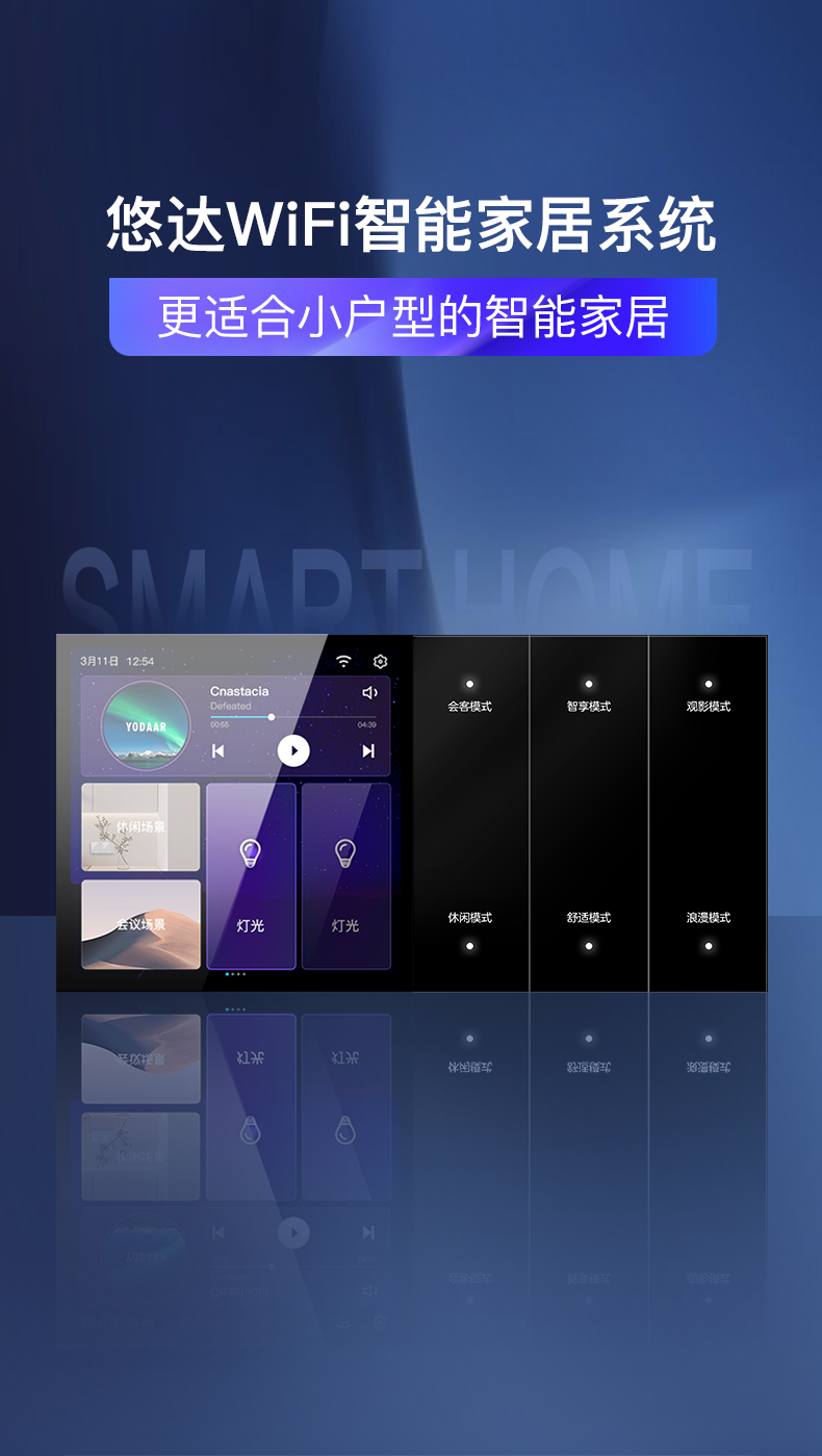 不僅如此,它還與悠達背景音樂系統深度融合,將背景音樂控制屏升級為智能中控屏后,即可輕松掌控全屋智能家居,與任意設備搭配,就是一個完整的智能家居系統,智能中控屏和智能開關面板組合,就可以實現對燈光、窗簾、背景音樂等智能設備的控制,不同智能設備如燈光、窗簾、安防等都可以根據需要靈活組建,讓你輕輕松松享受智能生活。