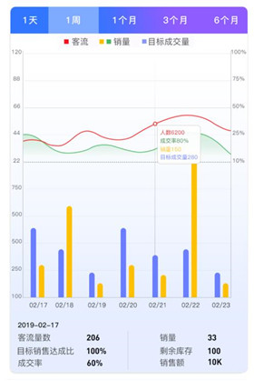 營(yíng)業(yè)額是判斷經(jīng)營(yíng)好壞的重要標(biāo)準(zhǔn),而只有對(duì)各項(xiàng)銷售數(shù)據(jù)進(jìn)行深入分析,才能更好地發(fā)現(xiàn)問(wèn)題、解決問(wèn)題。針對(duì)此,悠達(dá)智慧店鋪通過(guò)可視化圖表,對(duì)門(mén)店的銷售額、目標(biāo)成交量、客流轉(zhuǎn)化率等進(jìn)行多維度展示,每日、每周、每月各項(xiàng)報(bào)表一鍵生成,以精準(zhǔn)的數(shù)據(jù)和階段性交叉對(duì)比,幫助運(yùn)營(yíng)者更清晰直觀地了解門(mén)店銷售情況,并據(jù)此做出科學(xué)的銷售決策,制定合適的績(jī)效獎(jiǎng)勵(lì)機(jī)制,激發(fā)員工銷售熱情。